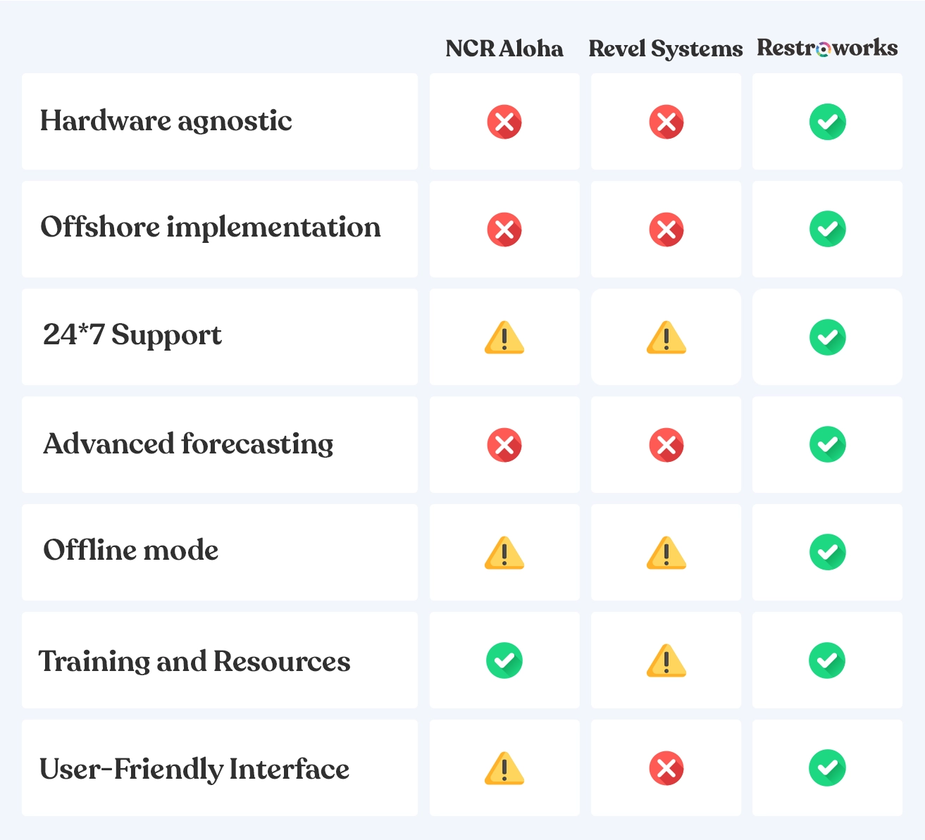 NCR Aloha combines legacy on-premise deployments with Aloha Cloud and is deeply embedded in traditional restaurants and hotel environments. Revel is fully cloud-based, runs on iPads, and bundles strong inventory, delivery, and multi-location tools. Restroworks goes a step further by being hardware-agnostic and unifying POS, inventory, kitchen, CX, and reporting on one platform, so you are not stitching modules together.